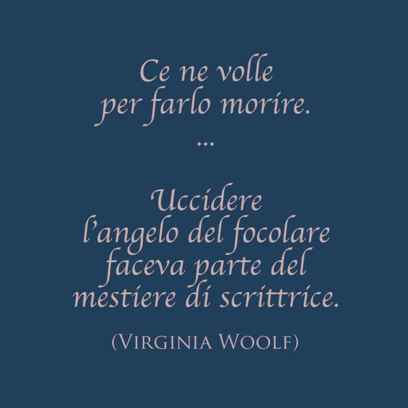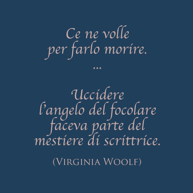 «Mi accorsi che se volevo recensire dei libri, dovevo combattere contro un certo fantasma. E il fantasma era una donna, e quando imparai a conoscerla meglio la chiamai come la protagonista di una famosa poesia, la chiamai l’Angelo del focolare. Era lei che quando scrivevo una recensione si metteva in mezzo tra me e il mio foglio. Era lei che mi angustiava e mi faceva perdere tempo e mi tormentava a tal punto che alla fine la uccisi. Voi che appartenete a una generazione più giovane e più felice forse non capite che cosa intendo per Angelo del focolare.