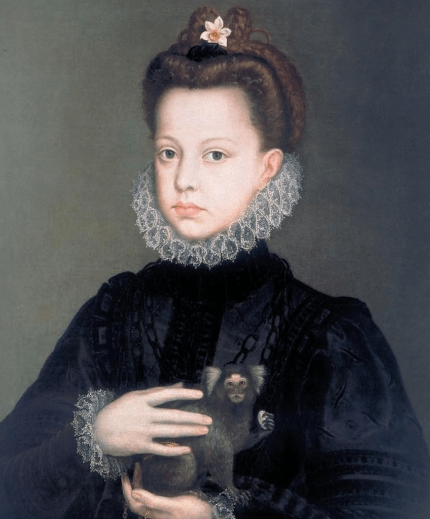 Nel dipinto, realizzato da Sofonisba Anguissola, l’infanta di Spagna Catalina Micaela, che sarebbe diventata Duchessa di Savoia nel 1585, sfoggia tra i capelli un narciso, probabilmente colto nei giardini di Aranjuez, e tiene tra le mani una piccola scimmia Titì dal ciuffo bianco, originaria della selva amazzonica.