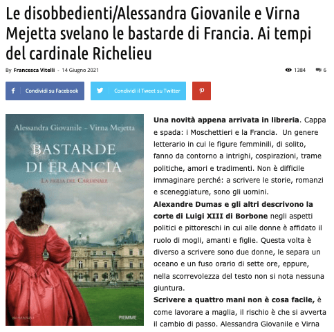 Un titolo “Bastarde di Francia” sicuramente d’effetto, ma il sottotitolo “La figlia del cardinale” è molto attrattivo! Personalmente, quando l’ho visto, mi sono incuriosita molto, soprattutto quando poi nella quarta di copertina ho visto il nome di Luigi XIII e del cardinale Richelieu. Come vi è venuta l’idea progettuale di questo romanzo?(…continua)