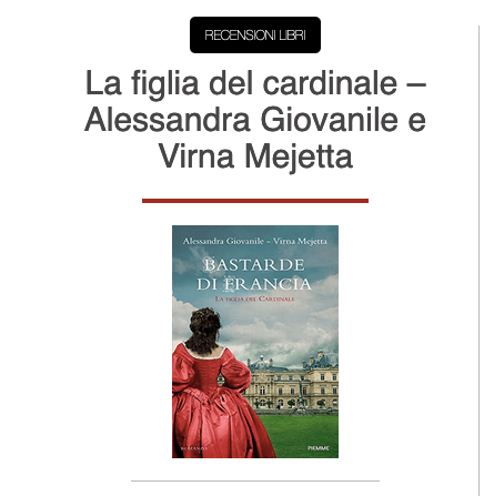 “Con l’augurio che questa storia ti catturi e ti trascini in un’epoca ormai lontana”. Questa è la dedica che, nel giorno della presentazione, Alessandra Giovanile mi aveva scritto su una copia del libro “BASTARDE DI FRANCIA. La figlia del cardinale”, scritto da lei e Virna Mejetta e pubblicato per Piemme da Mondadori Libri. (…continua)